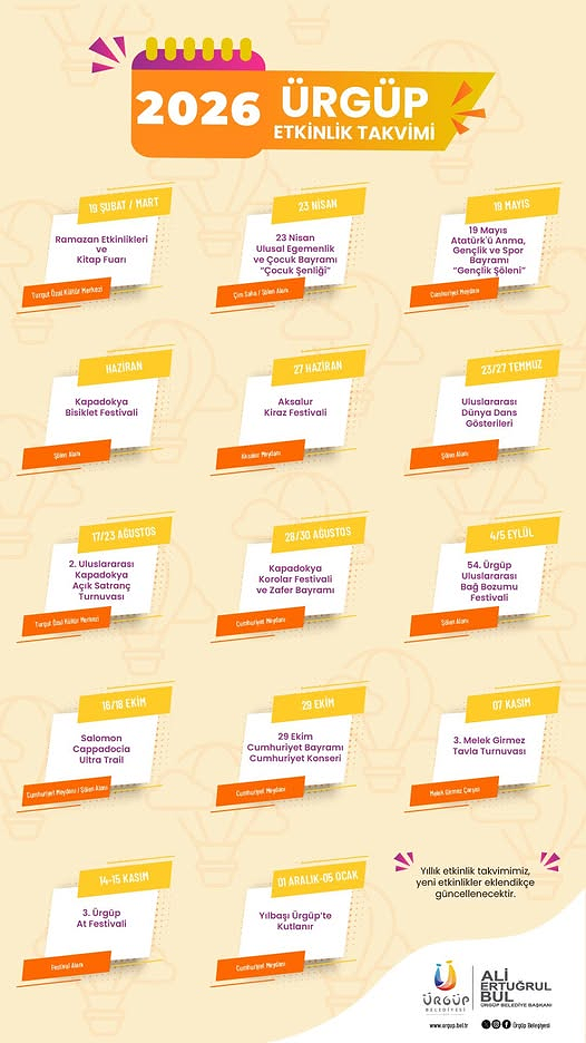 Ürgüp Belediye Başkanı Ali Ertuğrul Bul, kentin 2026 yılına yönelik kültür, sanat ve spor etkinliklerini kapsayan “Ürgüp 2026 Etkinlik Takvimi”ni kamuoyuyla paylaştı. Başkan Bul, sosyal medya hesabından yaptığı paylaşımda takvimin güncellenebilir olduğunu belirterek, yeni etkinliklerin hazır oldukça eklenerek takvimin yenileneceğini ifade etti.