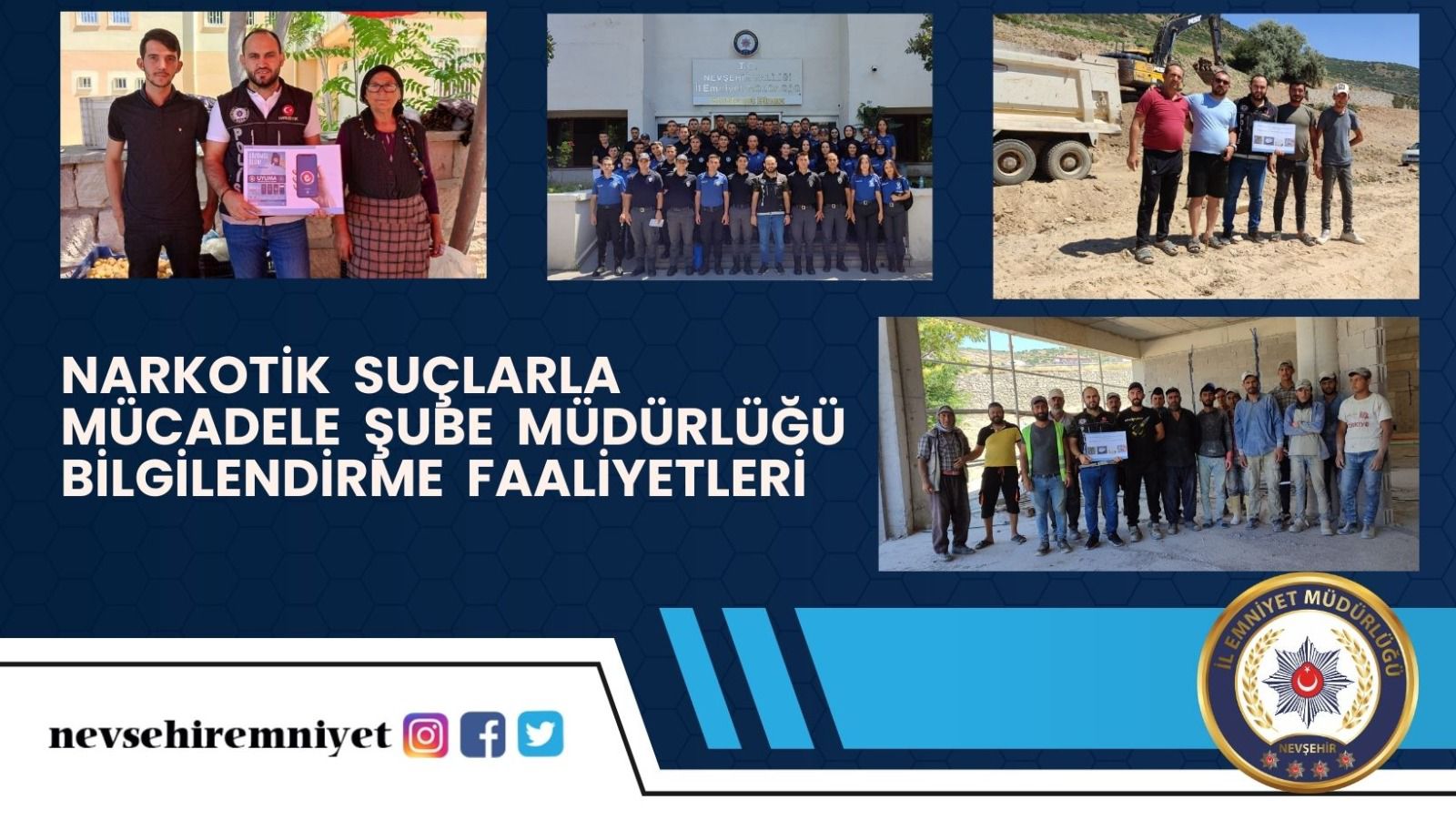 Nevşehir Narkotik Suçlarla Mücadele Şube Müdürlüğü Tubim Büro Amirliği bilgilendirme faaliyetleri çerçevesinde 1-7 Ağustos 2023 tarihleri arasında 29. Dönem POMEM Polis Adaylarına, Göre Yolu Millet Bahçesi İnşaat Alanında ve 2000 Evler Mahallesi Cuma Pazarında vatandaşlara UYUMA PROJESİ, Narko Nokta, En İyi Narkotik Polisi Anne ve Önleyici Faaliyetleri hakkında toplamda 122 kişiye bilgilendirme yapıldı.