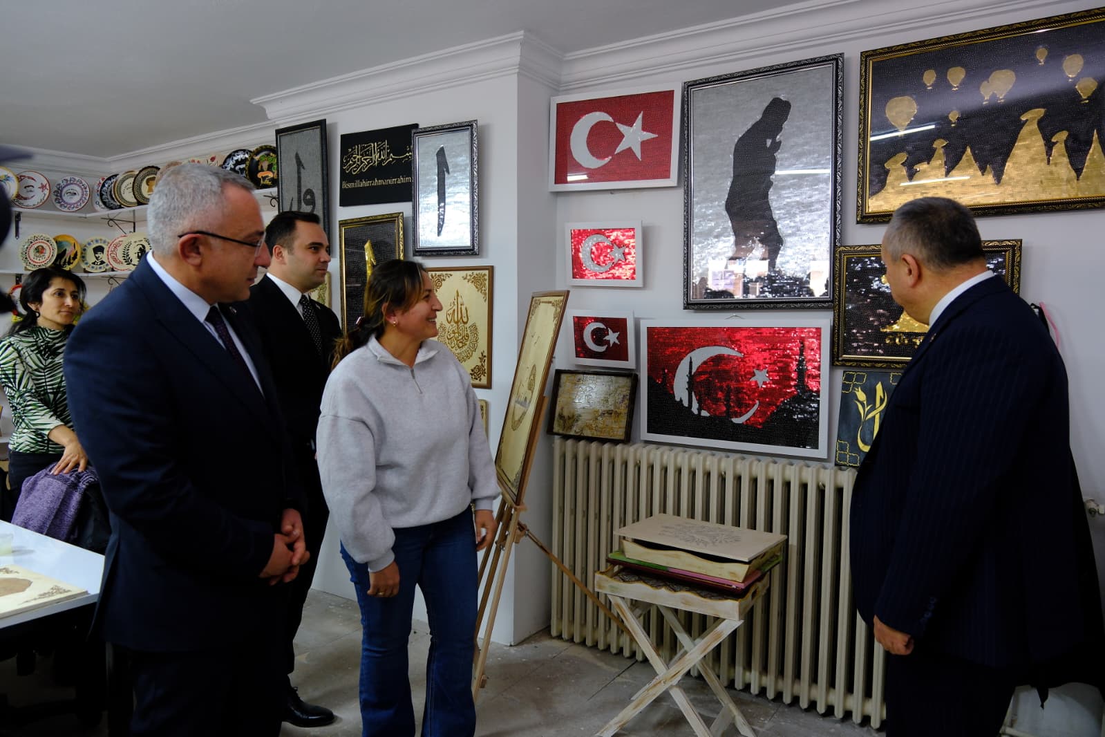 Ziyaret programı kapsamında Belediye Kadın Çalışma Merkezi ziyaret edilerek merkezde yürütülen çalışmalar hakkında yetkililerden bilgi alındı. Heyet ayrıca ilçede faaliyet gösteren esnafları ziyaret ederek talep ve önerileri dinledi.