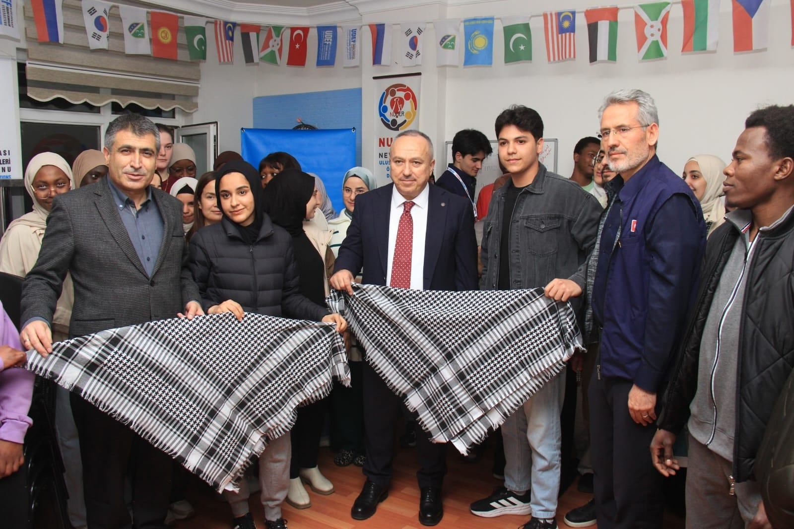 Uluslararası öğrenciler ise Türkiye’de ve Nevşehir’de bulunmaktan memnun olduklarını belirterek huzurlu ve güvenli bir ortamda eğitimlerini sürdürdüklerini ifade ettiler. Daha sonra Filistinli öğrenciler Vali Fidan ve Rektör Aktekin’e günün anlam ve önemine binaen Filistin keyfiyesi hediye ettiler.