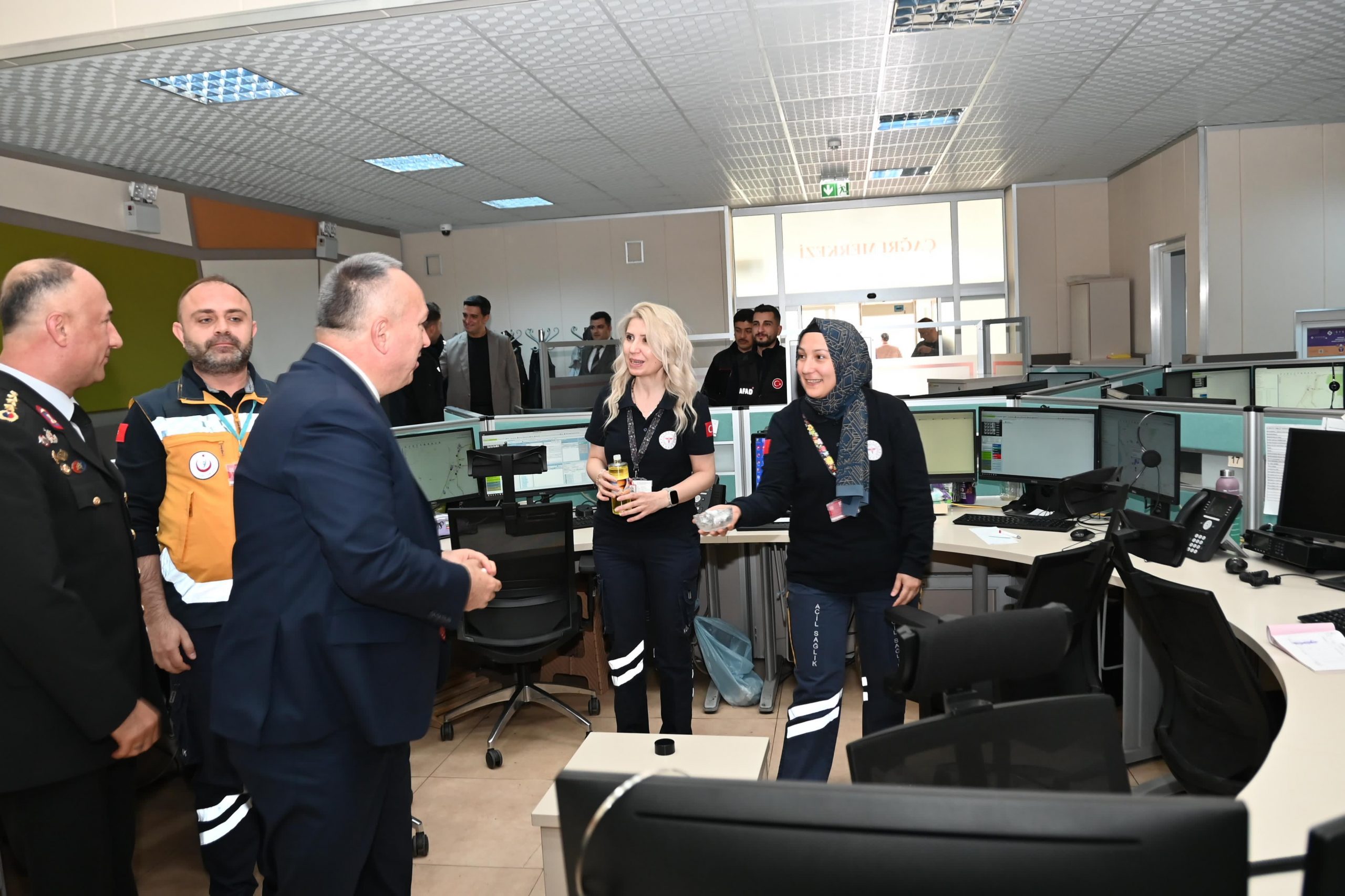 Ardından 112 Acil Çağrı Merkezi ve Güvenlik ve Acil Durumlar Koordinasyon Merkezi’ni (GAMER) ziyaret ederek burada da Ramazan Bayramı boyunca görevi başında bulunan görevli personele özverili çalışmalarından dolayı teşekkür ederek bayramlarını kutladı.