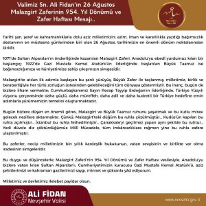 Nevşehir Valisi Ali fidan 26 Ağustos Malazgirt zaferi’nin dokuz 54. yıl dönümü ve zafer haftası dolayısıyla bir mesaj yayımladı.