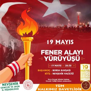 Nevşehir’de Valilik himayesinde 19 Mayıs Atatürk’ü Anma, Gençlik ve Spor Bayramı dolayısıyla Fener Alayı Yürüyüşü düzenlenecek.