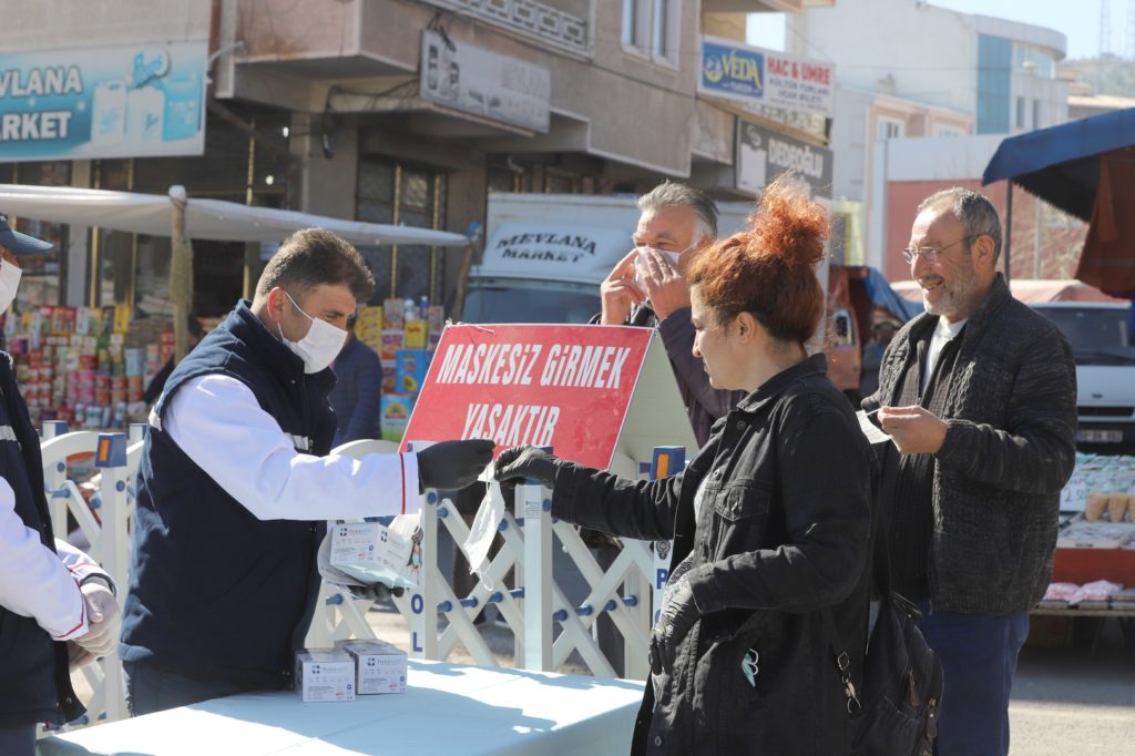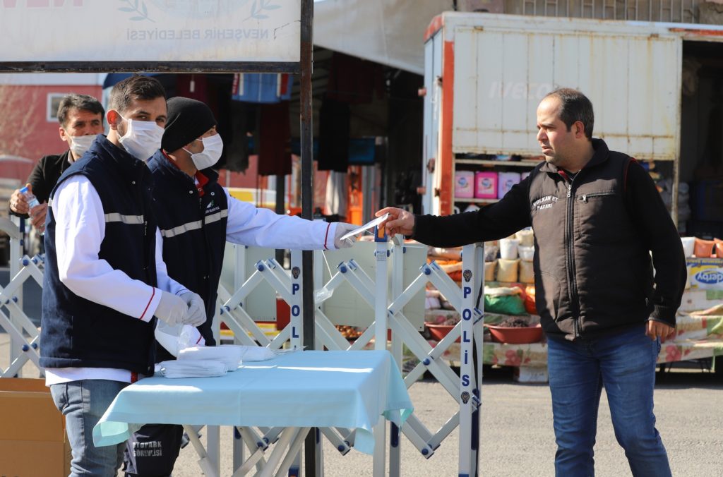 Nevşehir Belediyesi, hafta sonu mahalle muhtarları aracılığı ile ve pazar yerinde kurduğu stantta vatandaşlara 20 bin adet maske dağıttı.