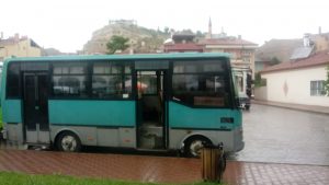 Nevşehir’in Gülşehir ilçesinde akşam saatlerinde birden bastıran yağmurdan korunmak isteyen bir sokak köpeği kendisine korunak olarak halk otobüsünü seçti.