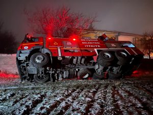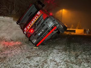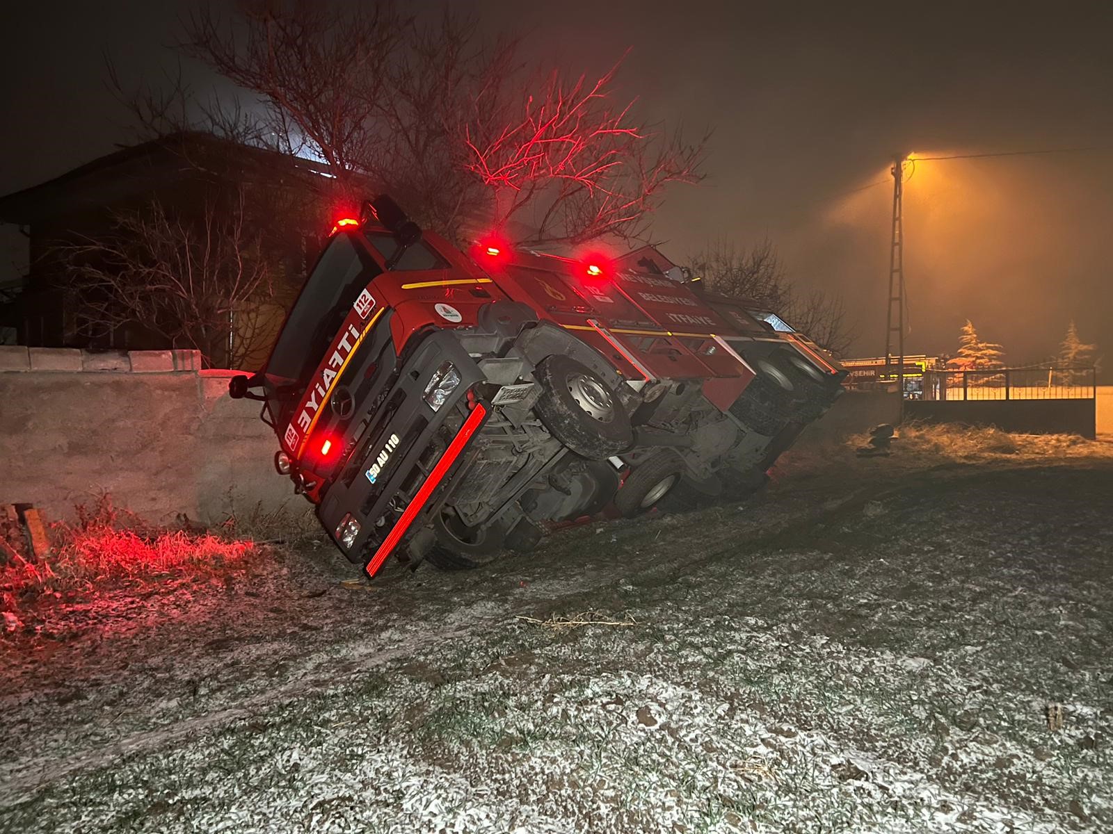 Nevşehir Merkeze bağlı Boğaz Köyü’nde çıkan yangına müdahale eden Nevşehir Belediyesine ait itfaiye aracı yangına müdahale ettiği sırada devrildi.