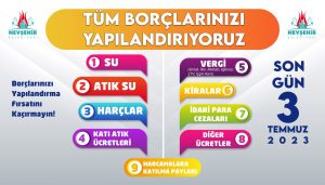 Nevşehir Belediyesi “Bazı Alacakların Yeniden Yapılandırılmasına İlişkin Kanun’ kapsamında mükelleflerin borçlarına ilişkin yapılandırma işlemlerini 3 Temmuz 2023 mesai bitimine kadar yapabileceğini hatırlatarak mükelleflerine çağrıda bulundu.