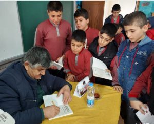 Yazar Aytekin söyleşi sonrası öğrencilere “Nevşehirli Kahramanlar Harp Hikayeleri” kitabını imzaladı.