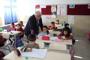 İlkokul öğrencilerinin de sınıfına ziyaret gerçekleştiren Yazıcı, öğrencilerin istek ve taleplerini dinleyerek ders içi etkinliklerine eşlik etti.