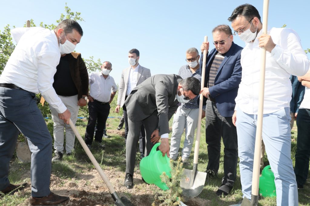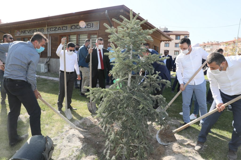 Belediye Başkanı Arı ve beraberindekiler daha sonra koronavirüs nedeniyle hayatını kaybeden 5 eczacı için Cevher Dudayev Mahallesindeki Eczacılar Konağı önündeki alana fidan dikti.