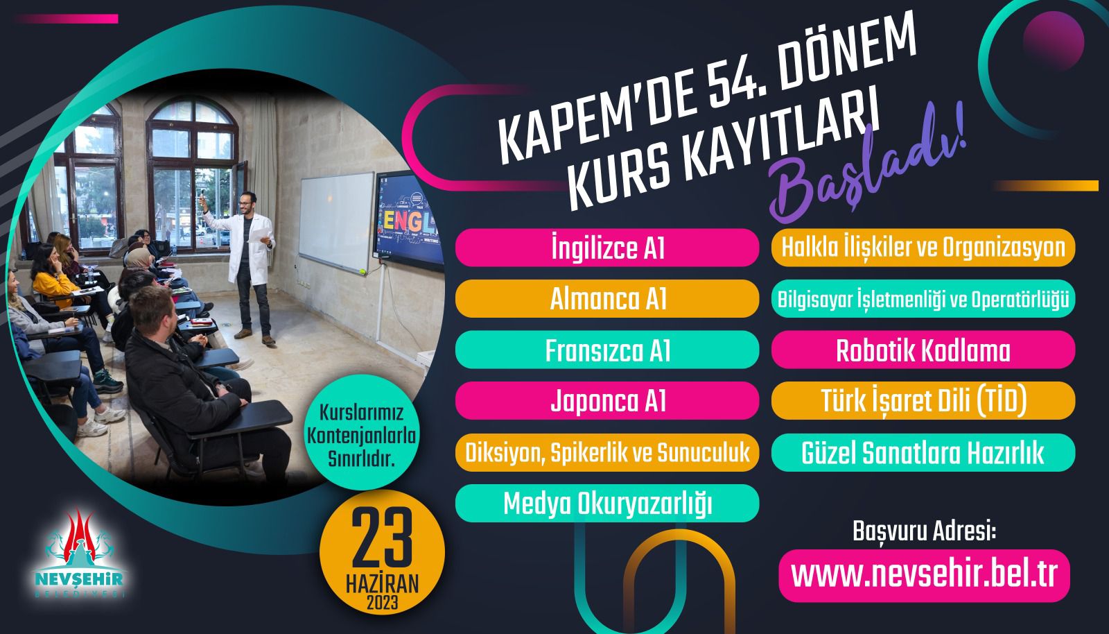 Müdürlüğü bünyesinde alanında uzman eğitmen kadrosuyla düzenlediği kurslar sayesinde Nevşehirlilere ücretsiz sertifikalı imkanı sunan Kapadokya Eğitim Merkezi (KAPEM)’de 54. Dönem Kursları için kayıtlar başladı.