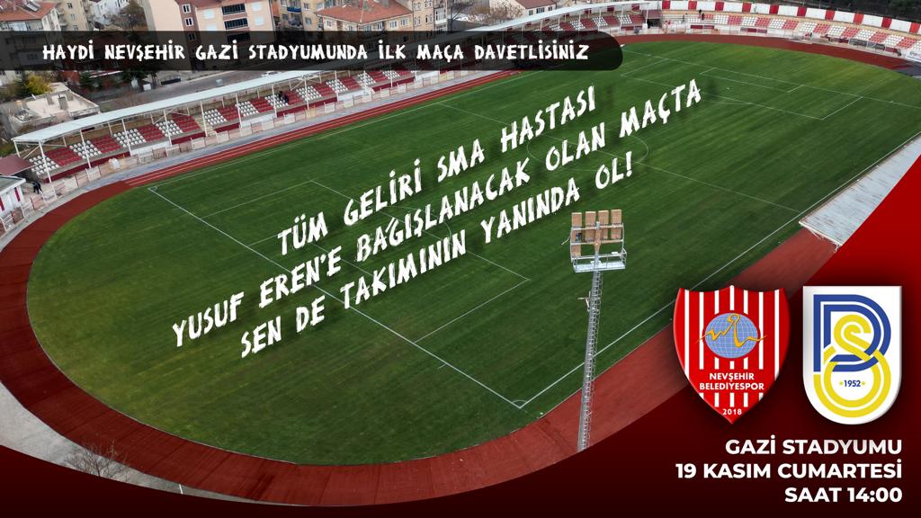 Nevşehir Belediyespor, yenilenen Gazi Stadı’nda cumartesi günü saat 14.00’te Derince Belediyespor ile karşılaşacak. Uzun bir aradan sonra kendi stadında taraftarları ile buluşacak olan kırmızı beyazlı ekip, maçın tüm bilet gelirini SMA hastası Yusuf Eren için başlatılan kampanyaya bağışlayacak.