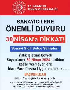 Bu çerçevede sanayi siciline kayıt olan işletmelerin 2023 yılına ait Yıllık İşletme Cetvellerini Sanayi ve Teknoloji Bakanlığınca yayımlanan SGM 2014/11 no’lu Tebliğin 11’nci maddesi uyarınca e- Devlet kapısı veya Bakanlık web sayfası Sanayi Sicil Bilgi Sistemi üzerinden (http://sanayisicil.sanayi.gov.tr) elektronik ortamda vermeleri gerekmektedir. Yoğunluk yaşanmaması adına son güne bırakılmaması önem arz etmektedir. Sistem 7 gün 24 saat açık olduğundan mesai saatleri dışında da girişler yapılabilir.