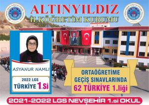 ÖĞRENCİMİZ ASYANUR NAMLI 2022 LGS RESMİ SONUÇLARINA GÖRE TÜM SORULARI DOĞRU CEVAPLAYARAK TÜRKİYE 1.Sİ OLMUŞTUR. NEVŞEHİR’DE VE ÇEVRE İLLERDE TEK TÜRKİYE 1.Sİ ÇIKARMIŞ OLMANIN HAKLI GURURUNU YAŞAYAN ALTINYILDIZ İLKÖĞRETİM KURUMU OLARAK