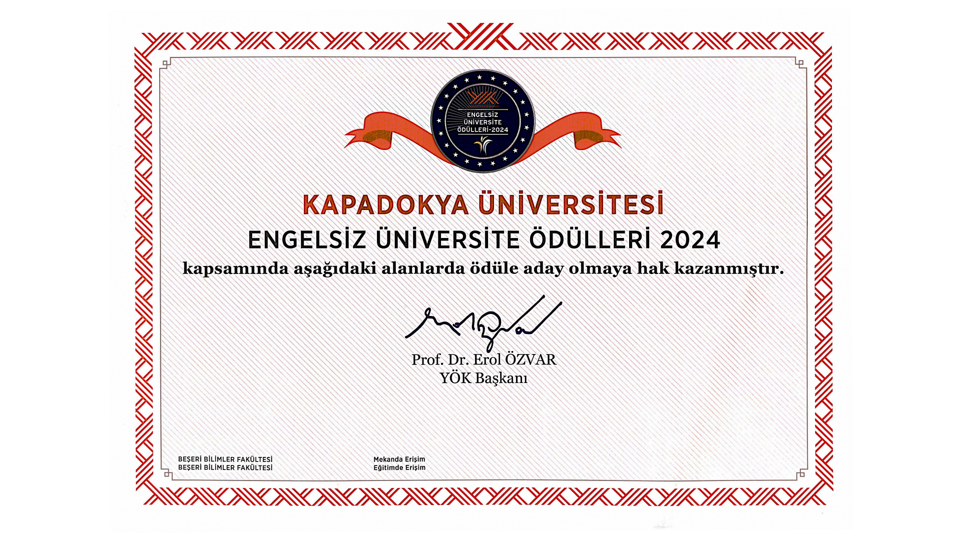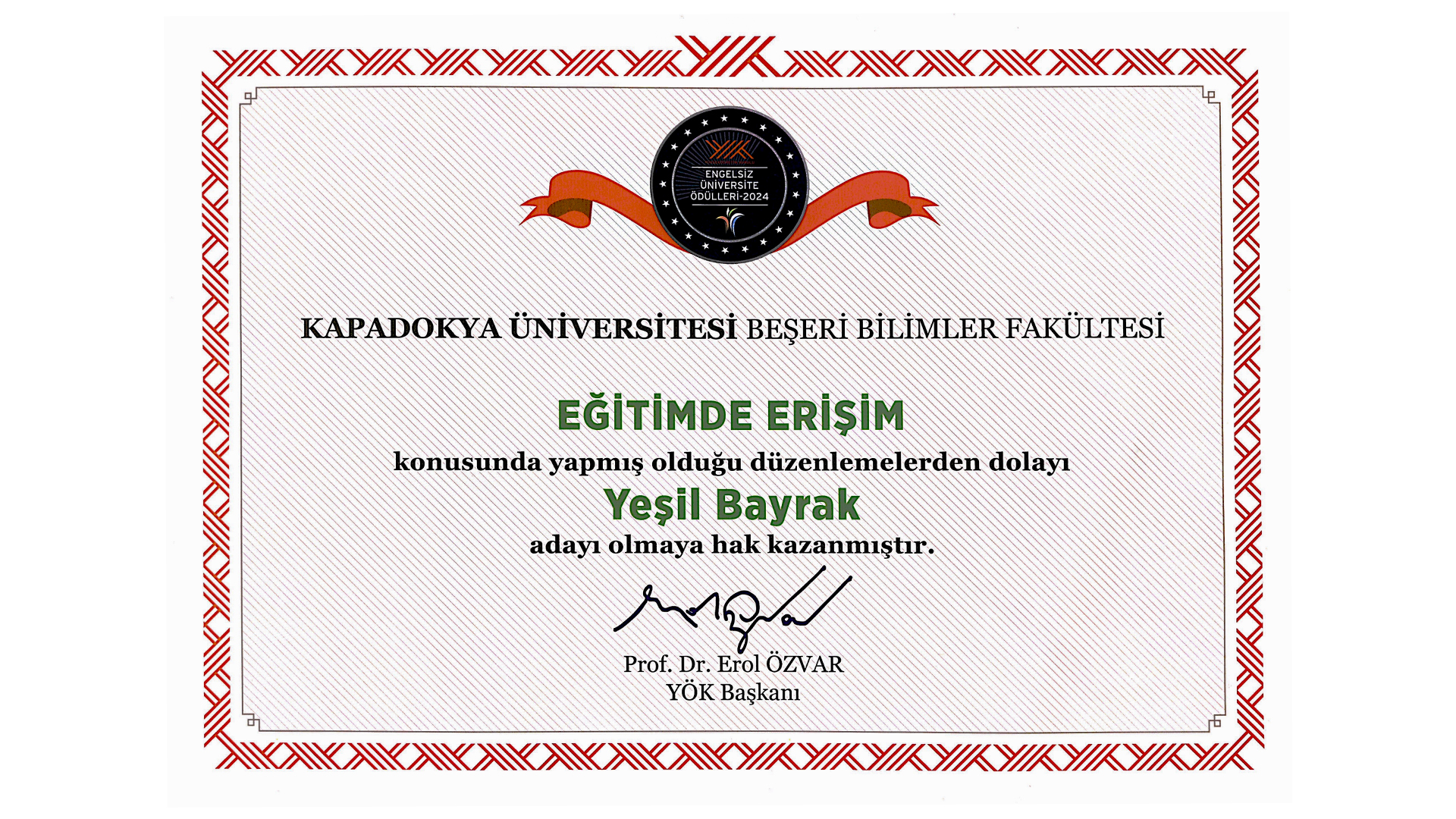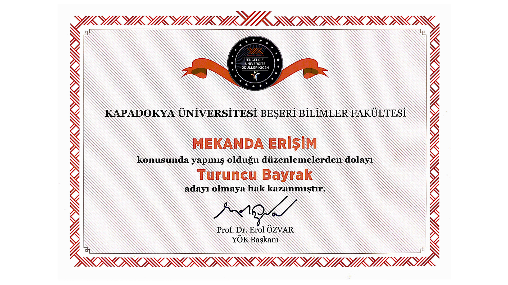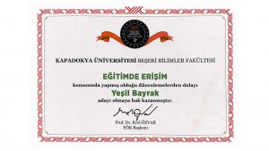Kapadokya Üniversitesi (KÜN), Eğitimde Erişim konusunda yapmış olduğu düzenlemelerden dolayı Yeşil Bayrak adayı olmaya, Mekânda Erişim konusunda yapmış olduğu düzenlemelerden dolayı Turuncu Bayrak ödülü kazandı.