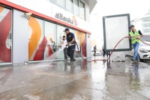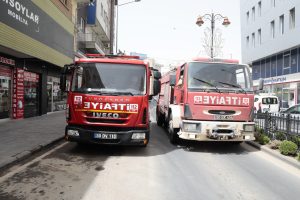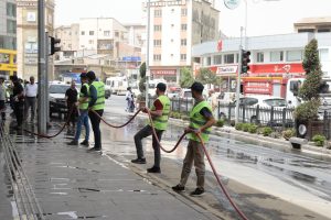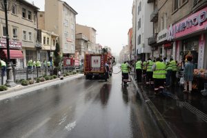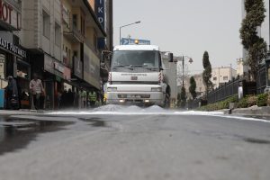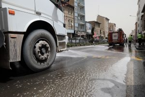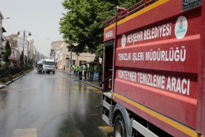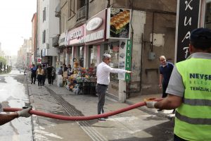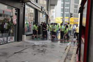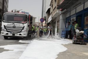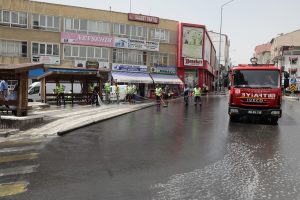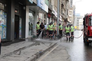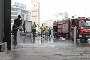 Belediye Temizlik İşleri Müdürlüğü ve İtfaiye Müdürlüğü ekipleri, ana caddeler ile kaldırımları tazyikli su ve fırçayla yıkayarak, iş yerlerinin önlerini temizledi.