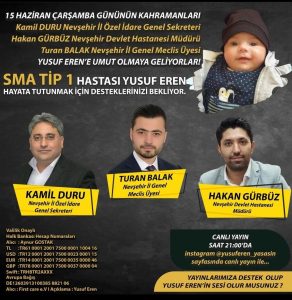 İl Özel İdaresi Genel Sekreteri Kâmil Duru, İl genel meclisi üyesi Turan Balak ve Nevşehir Devlet Hastanesi Müdürü Dr. SMA Tip 1 Hastası Yusuf Eren’e destek olmak için canlı yayın programına konuk olacaklar.