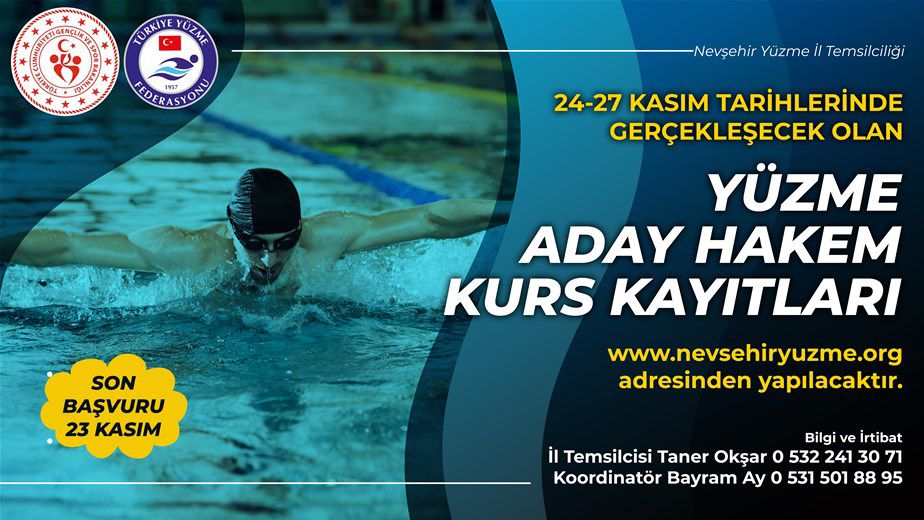 Türkiye Yüzme Federasyonu ile Gençlik ve Spor İl Müdürlüğü tarafından 24-27 Kasım 2022 tarihleri arasında Nevşehir’de Yüzme Aday Hakem Kursu açılacak.