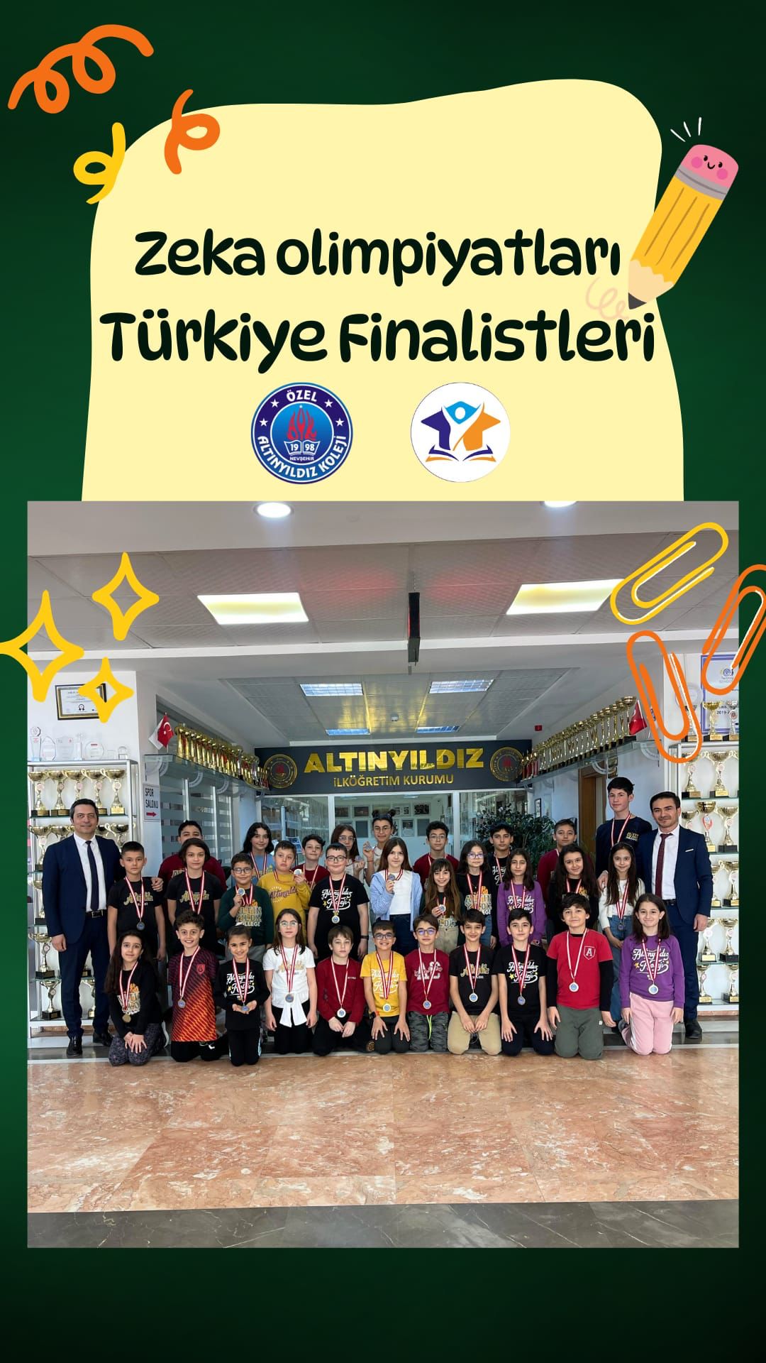 ZEKA OLİMPİYATLARI, öğrencilerimizin problem çözme, mantık yürütme ve analatik düşünme becerilerini ölçmek için düzenlenen bir yarışmadır.ZEKA OLİMPİYATLARI matematik, mantık bulmacaları ve bilgisayar bilimi gibi alanlarda zekayı ölçmeyi amaçlayan Türkiye geneli özel ve devlet okullarının katılım sağladığı yarışmada finalist olan öğrencilerimiz;