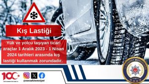 İlimiz genelinde 01 Aralık 2023 tarihi itibariyle zorunlu kış lastiği uygulaması başlıyor. Kış mevsiminde oluşan aşırı yağmur, sis, kar tipi, buzlanma gibi nedenlerle meydana gelebilecek kazaların en aza indirilmesi amacıyla Ülkemizde tescil edilmiş olsun veya olmasın ilimiz sınırları içerisinde şehirlerarası ve şehir içerisinde yük ve yolcu taşımacılığı yapan tüm araçlara (hususi panelvan, otomobil ve minibüs tipi araçlar hariç) 1 Aralık 2023 ile 1 Nisan 2024 tarihleri arasında kış lastiği kullanma zorunluluğu getirildi.