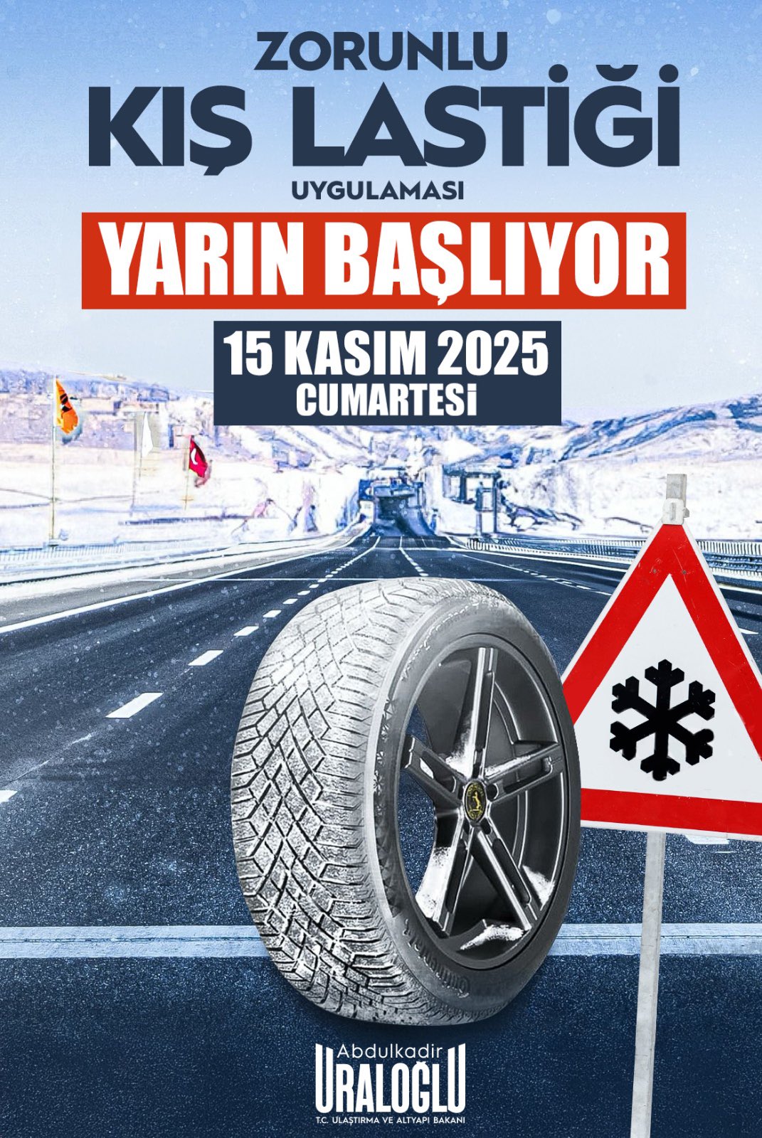 Ulaştırma ve Altyapı Bakanı Abdulkadir Uraloğlu, kış şartlarının etkisini artırmasıyla birlikte zorunlu kış lastiği uygulamasının 15 Kasım–15 Nisan tarihleri arasında geçerli olacağını duyurdu.